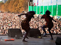 Ebony Bones : décidemment, après Noisettes, les filles de caractère sont à l'honneur cet après-midi à Rock en Seine. Le concert de la furie multicolore laisse un bilan mitigé. On a beaucoup aimé ses choristes (dansant sans aucune retenue, en transe du début à la fin du concert), son déguisement complètement barré, son super contact avec le public (elle a le show dans le sang et ça se sent), son énergie inépuisable, et on a adoré "The Musik" (appel irrésistible à la danse comme seules