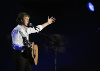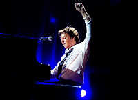 Le public reprend tous les refrains en choeur et continuera à soutenir son idole jusqu'à la dernière note de la soirée. "Bonsoir Paris, mon petit chou !" lance un Paul hilare et plus svelte que jamais (malgré les rides qui commencent à se faire nombreuses). "Only Mama Knows" (sur Memory Almost Full, 2007) et "Flaming Pie" (sur l'album éponyme de 1997) font retomber l'effervescence du début de concert, comme ce sera la cas pour la majorité de ses chansons post-Beatles. Il faut dire que malgré quelques très bons albums et une poignée de titres splendides, force est de constater que la carrière solo de Paul n'arrive pas à la cheville de ce qu'il a pu faire dans les 60's en compagnie de ses comparses liverpuldiens. A quelques exceptions près ("Let Me Roll It", "Band On The Run" et surtout "Live And Let Die"), ses titres solo seront donc accueillis avec politesse, en attendant le prochain extrait du fabuleux répertoire des Beatles.